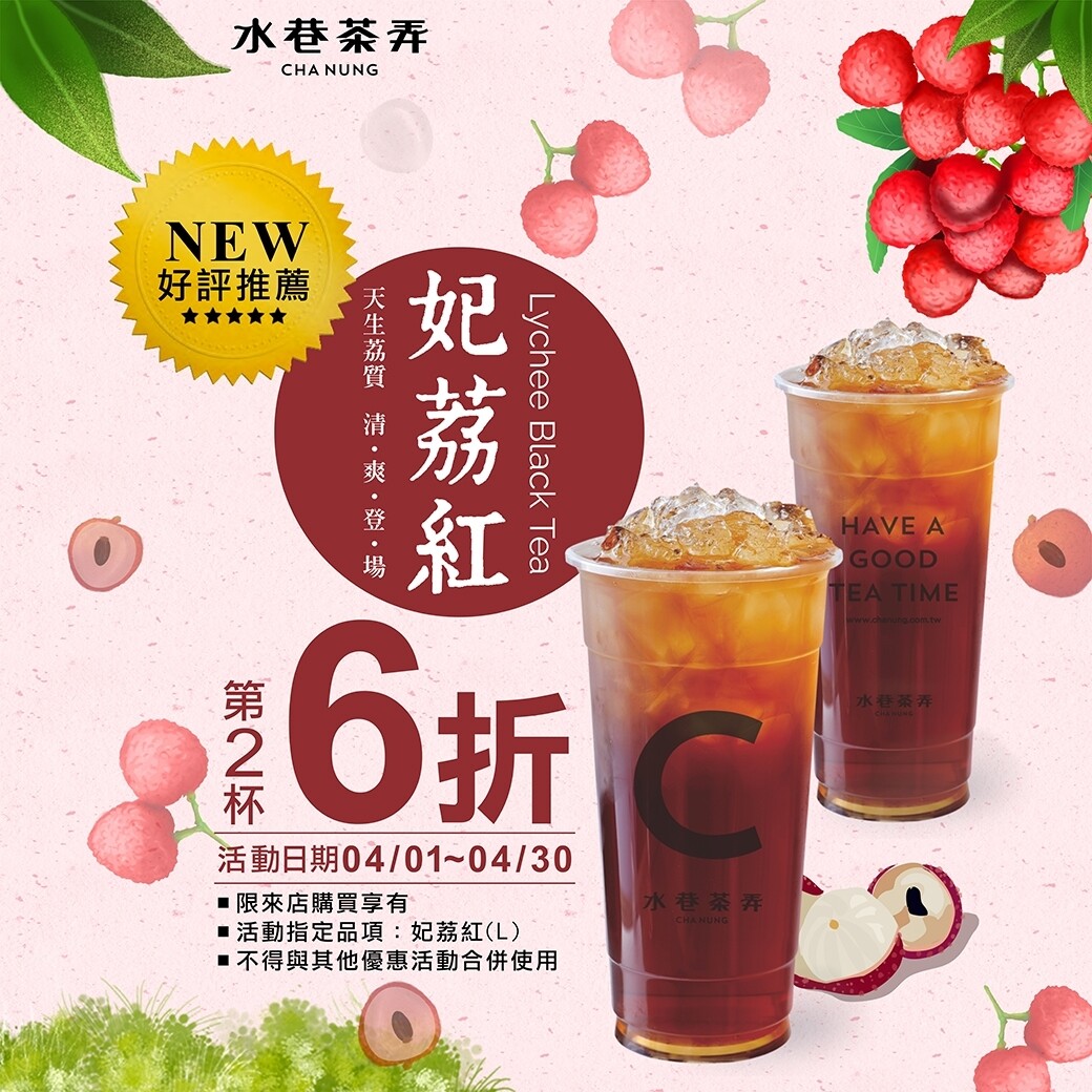 4/1-4/30凡來店購買妃荔紅,第二杯將享有𝟲折優惠!千萬不要錯過呦!