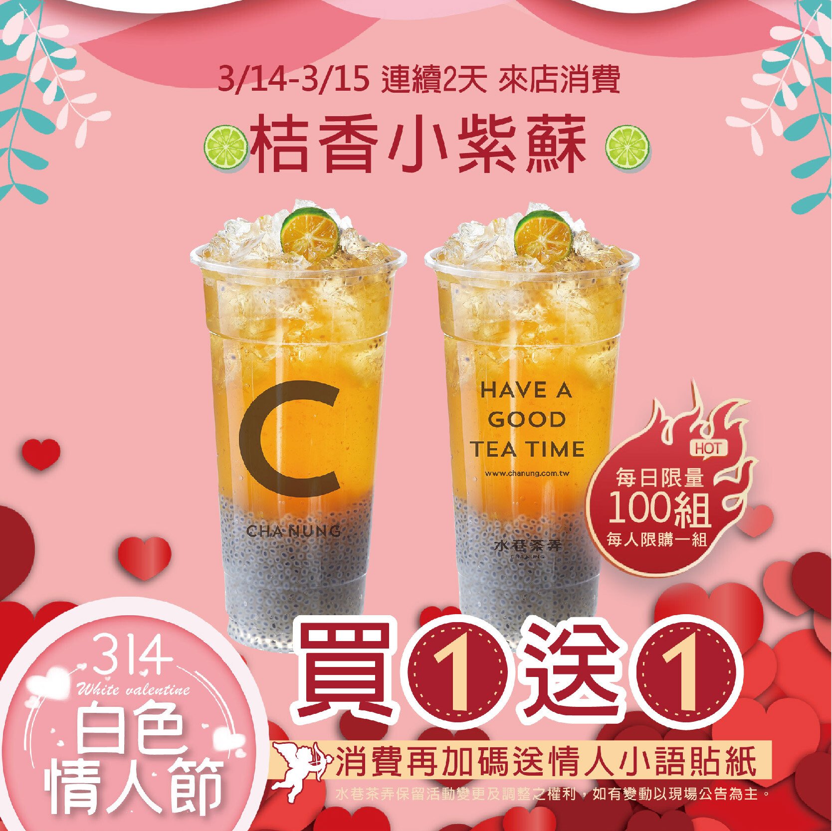 3/14(一)~3/15(二)到水巷茶弄門巿購買「桔香小紫蘇」除了 #買一送一,再加碼送情人小語貼紙! 將情話貼在飲料或任何地方表達愛意,為兩人的感情再加溫!